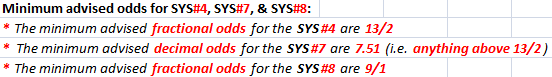 3: Back only systems 4, 7, and 8 if the available odds meet the advised prices.