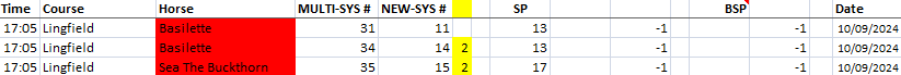 But why didn’t we back Basilette with a single bet, even though it was picked up by systems #31 and #34? Basilette was avoided because it was in a race with more than one qualifier, so it was already removed by Rule 1 of the system. Notice below that Sea The Buckthorn was also in the same race. As per Rule 1, we avoid races with multiple qualifiers, so this race was excluded