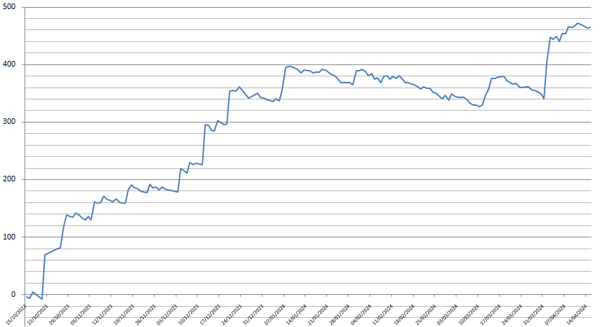 The line chart below shows the performance of SYS3 since mid-October 2023, detailing its profits and losses. During this period, we have enjoyed an overall return on investment of 50%, and the system has made an impressive return of 466 points to Betfair SP.